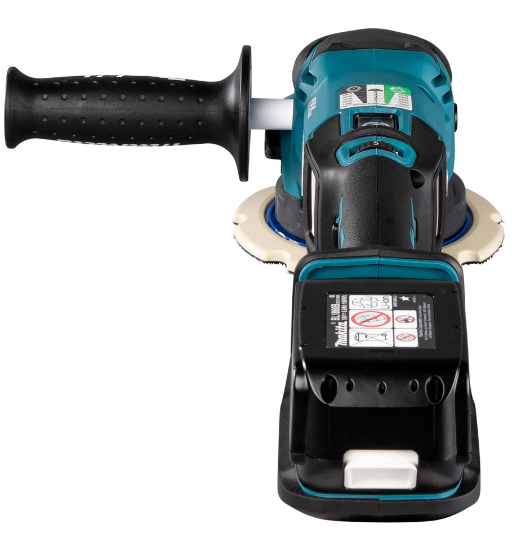 Normal mode is orbital action with forced rotation of the pad for rough polishing such as surface treatment. Finishing mode is orbital action with free rotation of the pad for fine polishing; allows 30 min. operation with 18V 6.0 Ah Li-ion battery. Damage guards for car body. Includes 2 x 5,0 Ah batteries and a charger.